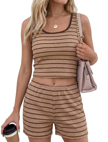 2 Piece Short Sets for Women Summer Striped Waffle Crop Top Matching Set for Beach Vacation Y2K Outfit