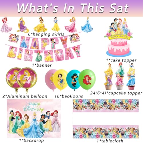 62PCS Disne Princess Party Supplies, Birthday Decorations Set Include Banner, Balloons, Backdrop, Cupcake Toppers, Tablecloth, Hanging Swirls for Kids Princess Theme Birthday Party