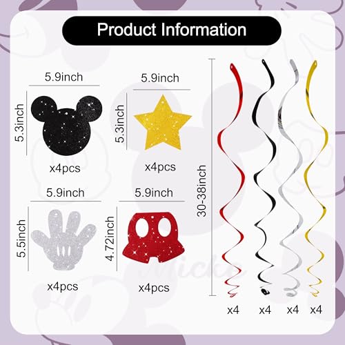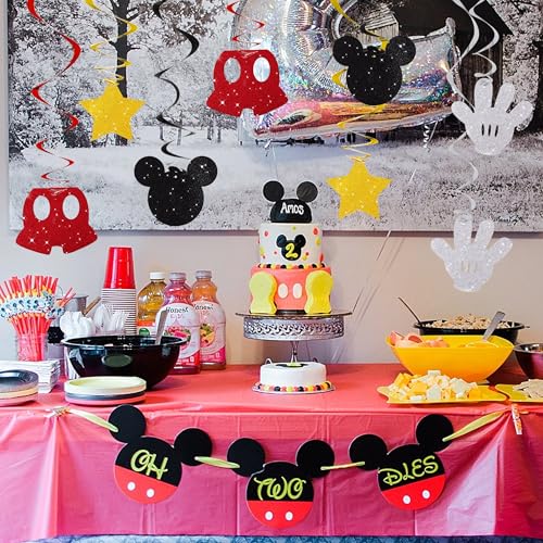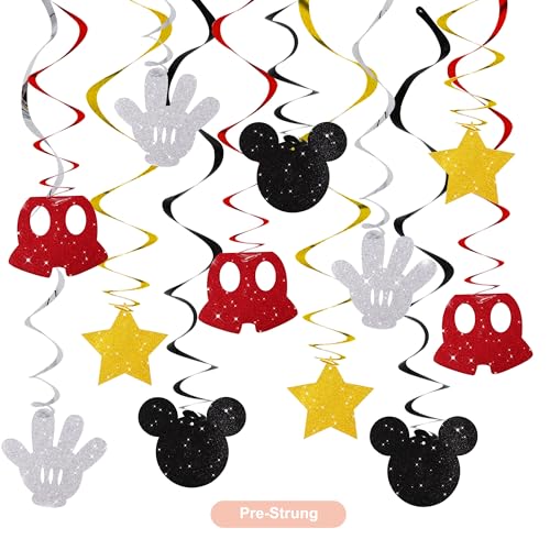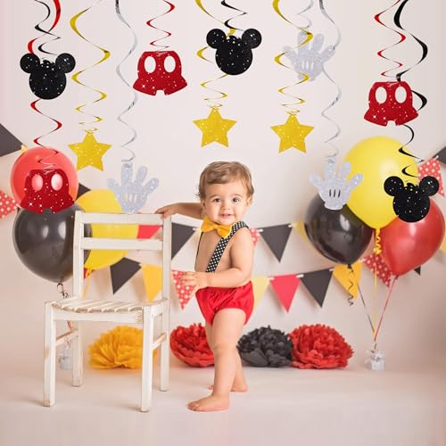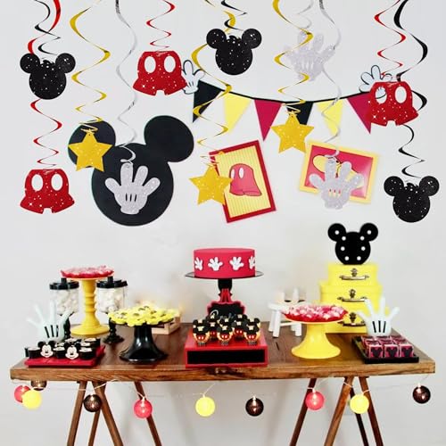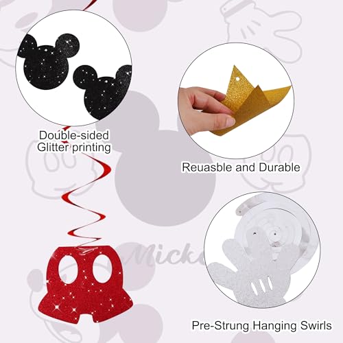 BEISHIDA 16 Pcs Mouse Hanging Swirl Decorations, Pre-Strung Mouse Birthday Party Decorations Red Gold Black Mouse Themed Birthday Party Supplies for Kids