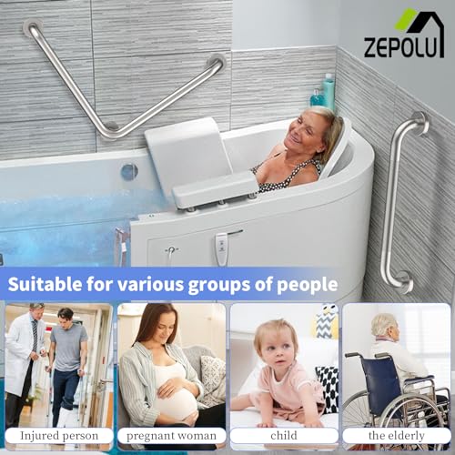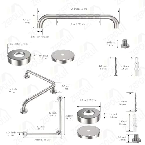 Size&Material: Enhance bathroom with Zepolu L-shaped and straight grab bar set. Designed to support you while you bath, shower, or use the toilet. Made of SUS304 stainless steel for a lasting strength and quality. Able to support up to 500 lbs of pull force to provide a stable, reliable handhold; L-Shaped Angled (90 degree); 16 x 16 inches (40 x 40 cm); 1 1/4 inch (3.2 cm) outer diameter. The length of straight grab bar: 20 inch; 1 1/4 inch (3.2 cm) outer diameter.Note: Please refer to Image 2.