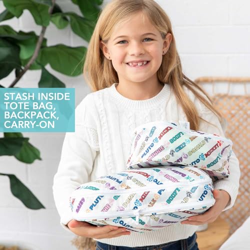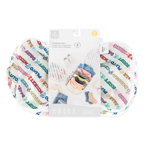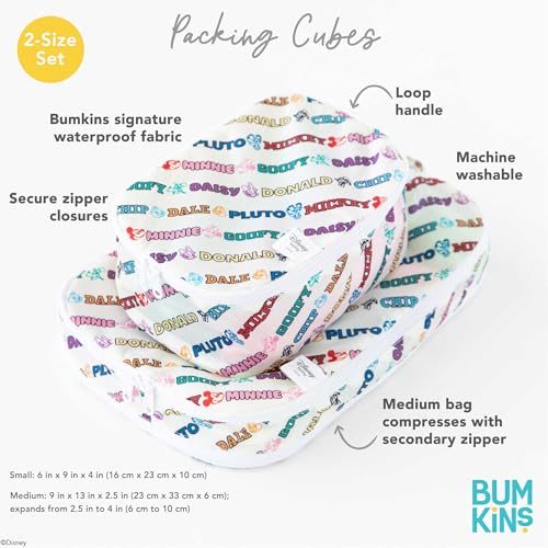 Pack smart with Bumkins Disney Packing Cubes, designed to help you organize your luggage efficiently. Made from lightweight polyester, these cubes are waterproof and quick-drying, ensuring your clothes stay clean and dry during travel. The set includes two sizes: a small cube perfect for intimates and swimwear, and a medium cube that can expand for lightweight outfits. When not in use, they lay flat for easy storage.