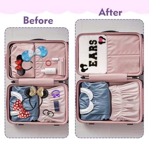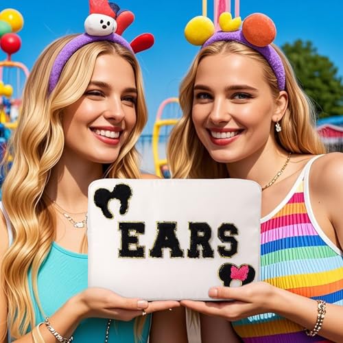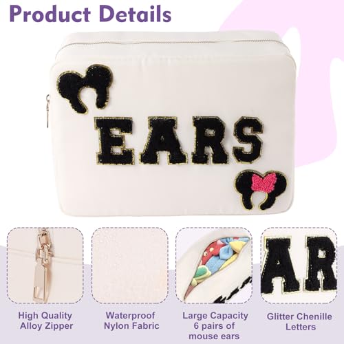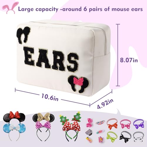 Premium Quality Accessories:Mouse ear holder is made of waterproof nylon material, it’s machine washable and easy to clean. This headband storage comes with 4 letter patches EARS, 1 mouse headband patch and 1 mouse with bow headband patch. Patches are SEWN not glued.Ears bag is with gold metal zipper and zipper puller,it’s durable and smooth to use.