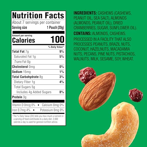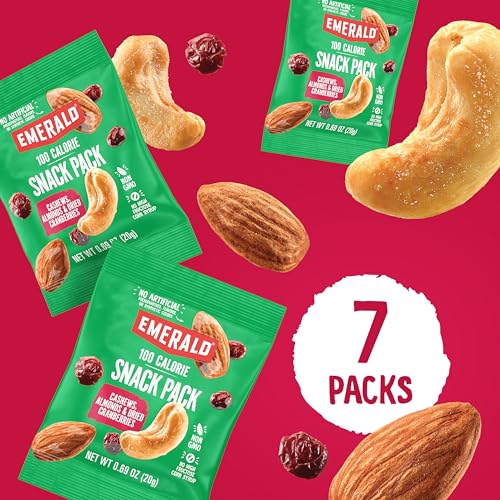 Emerald Nuts Cashews and Almonds with Dried Cranberries 7 Ct (1-Pack) | 100-Calorie Individual Packs of Nut Blend and Dried Fruit | Kosher Certified, Non-GMO, Contains No Artificial Preservatives, Flavors or Synthetic Colors