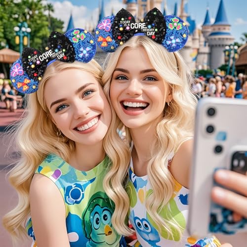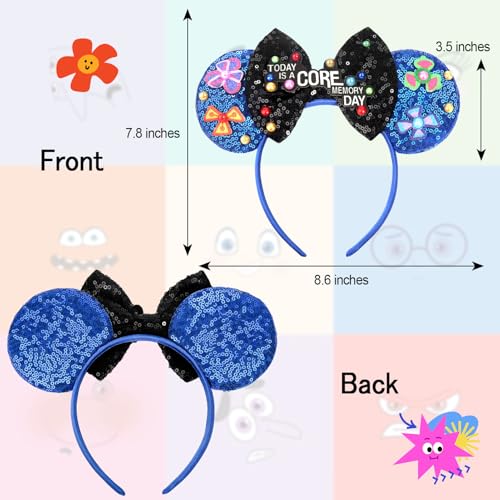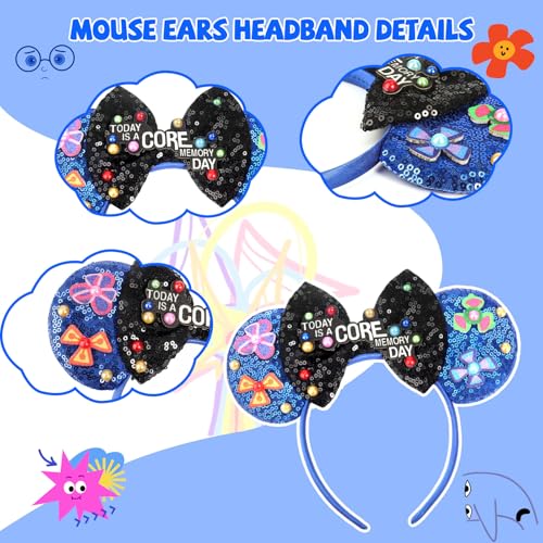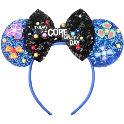 This dazzling headband features a vibrant oversized sequin bow and colors representing five emotions: Joy's yellow, Sadness' blue, Anger's red, Disgust' green, and Fear's purple. It declares "Today is a Core Memory Day," making every moment feel special. Constructed with thicker padding, the ears are designed to be durable and sturdy, ensuring they won't flop or wobble. Unlike other bulky park ears, this headband is lightweight and comfortable for all-day wear, minimizing discomfort behind the ears. The flexible design ensures a universal fit, making it suitable for most people.