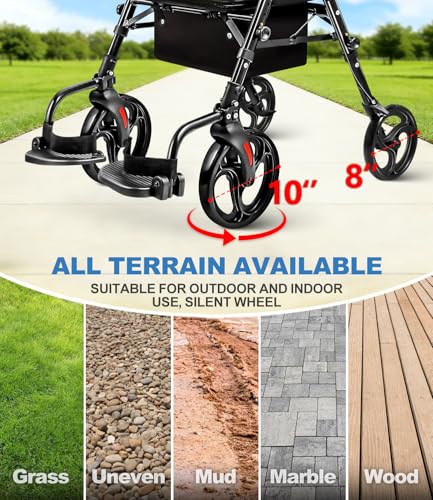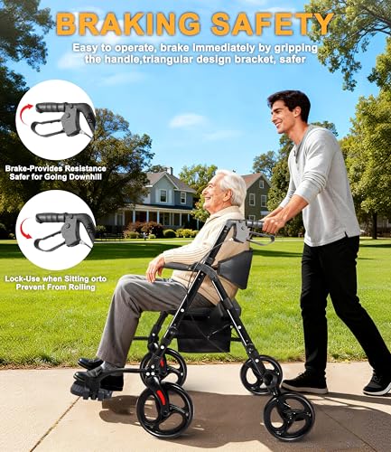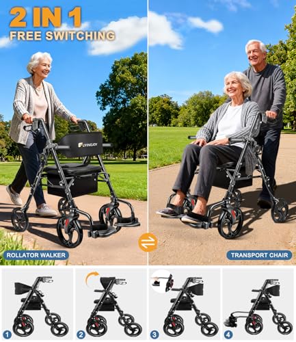 Foldable 2-in-1 Rollator Walker for Seniors with Seat, Lightweight Transport Wheelchair Combo 300 lbs Capacity, All-Terrain Tires, Anti-Tip Brakes, Adjustable Height 33.5″-40″