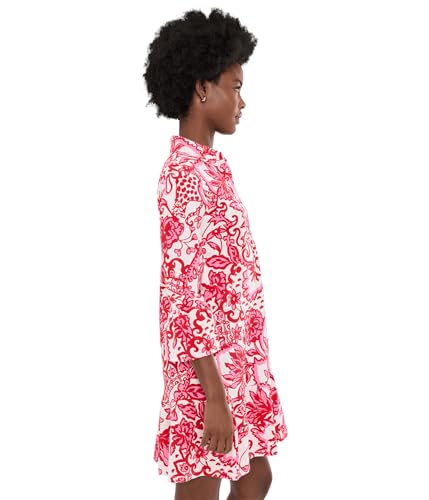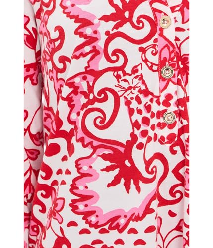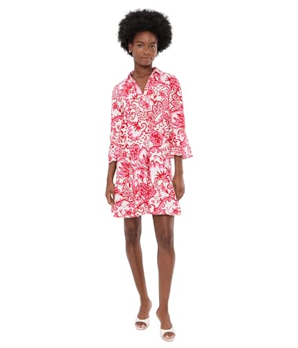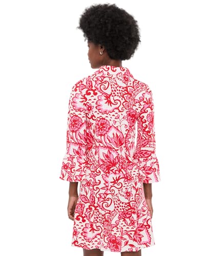 The Lilly Pulitzer Womens Delany Dress is a stylish addition to any wardrobe. This 20 1/2" swing fit shirtdress features a classic collar and gold buttons at the half placket, adding a touch of elegance. The 3/4 length ruffle hem sleeves and ruffled tier at the hem provide a feminine flair. Perfect for casual outings or special occasions, this dress combines comfort with chic design.