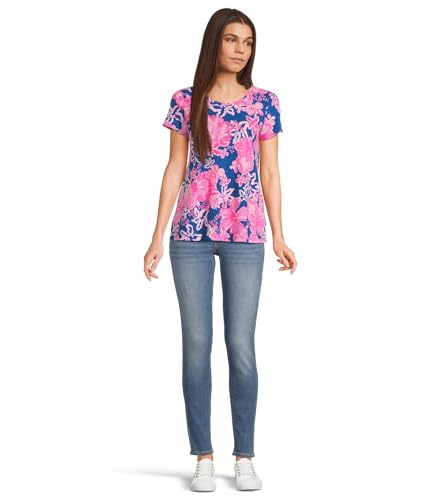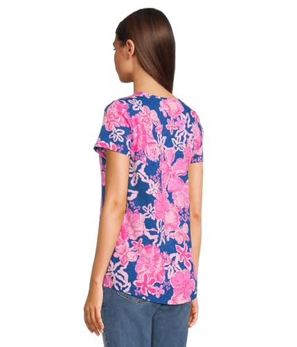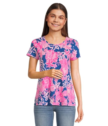 The Lilly Pulitzer Womens Etta Scoop Neck is a stylish and comfortable addition to your wardrobe. This easy-fit, short-sleeve pullover is perfect for casual outings or relaxing at home. Made from a soft slub fabric, it offers breathability and comfort throughout the day. The tee is machine washable, making it easy to care for and maintain. With a length of 26 inches, it provides a flattering silhouette for various body types.