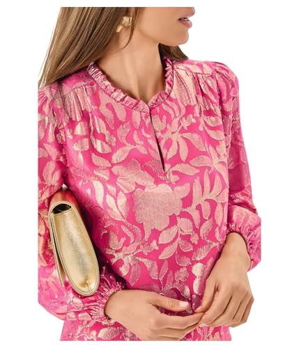 The Lilly Pulitzer Women's Giana Long Sleeve Silk Top is designed for comfort and style. This blouse features a 25 1/2" easy fit with a notch neck and a charming ruffle at the neckline. The long, full sleeves are complemented by elastic cuffs, providing a snug yet comfortable fit. The top is fully lined, ensuring a smooth feel against the skin.