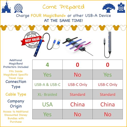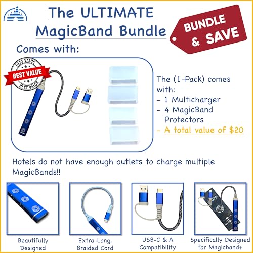 The ultimate MagicBand Bundle: Comes with one Multicharger compatible with all USB-A and USB-C plugs and 4 MagicBand Protectors! A $20 value, Bundle and Save. Our Multicharger is specifically designed for MagicBand unlike the others and our Protectors and designed to work with both the “kid-size” and “adult-size” MagicBands. Satisfaction is guaranteed.