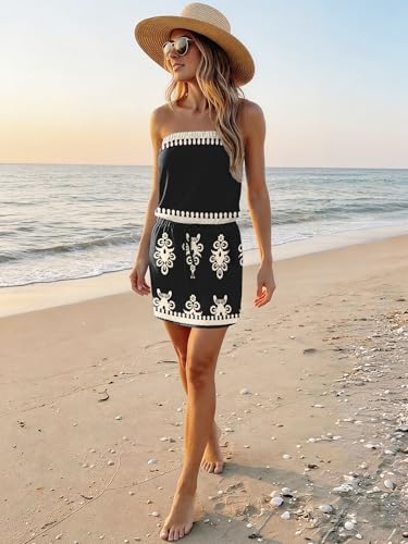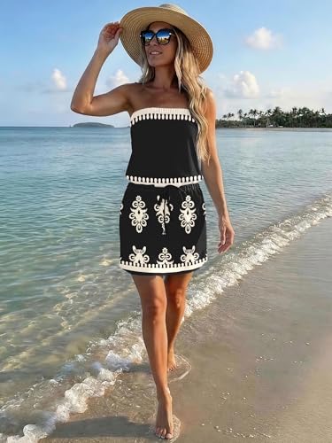 Summer Dress for Women Strapless Beach Cover Ups Boho Sundress Mini Dress Drawstring Waist with Pockets