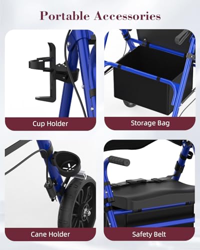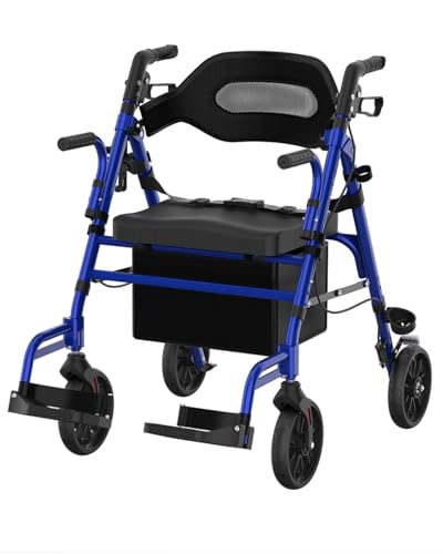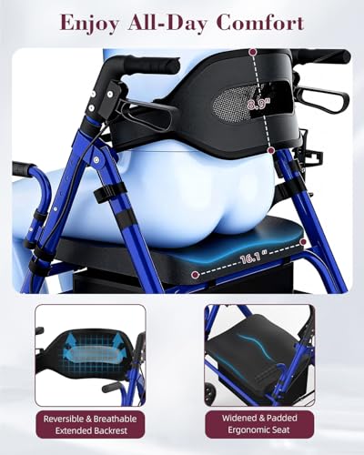 Walkers for Seniors with Seat, Extra Wide 2 in 1 Rollator Walker & Transport Chair with Reversible Backrest & Detachable Footrests, Foldable Wheelchair Combo with 8″ Anti-Slip PU Wheels, Blue