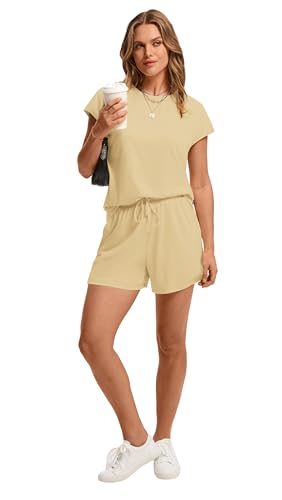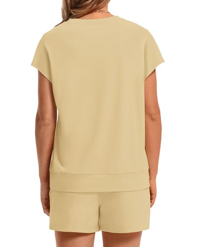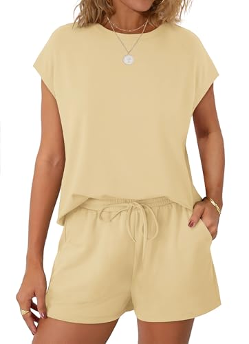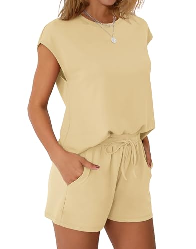 WIHOLL Two Piece Sets for Women Summer Crew Neck Lounge Short Sets Cap Sleeve Drawstring Sweatsuit with Pocket